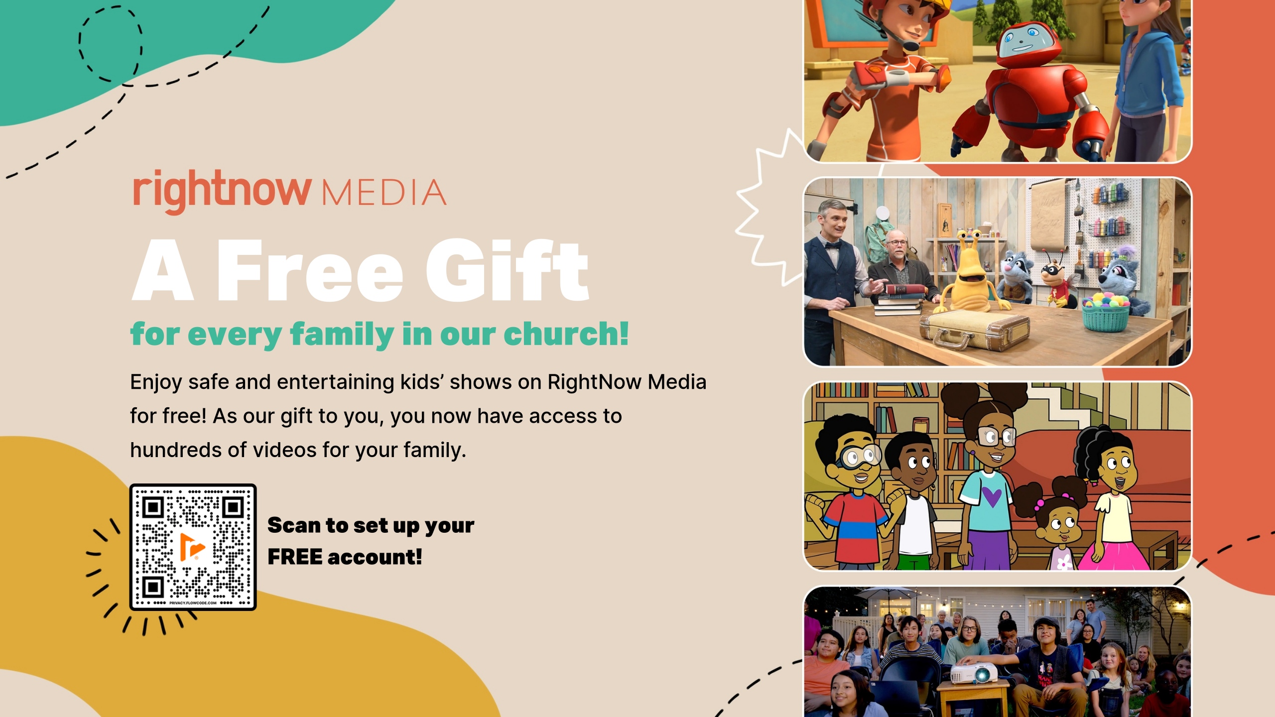 Have you downloaded the RightNow Media App? You can access it for free through our church. You’ll find hundreds of safe and entertaining kids’ shows, all of which, point your family to Jesus.